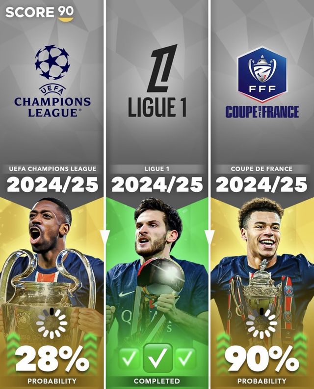 PSG 트레블 달성의 고비는 역시 UCL이다. PSG가 빅이어(UCL 우승 트로피)를 들어 올릴 확률은 28%다. 유럽에서 가장 강한 네 팀이 살아남아 경쟁하는 터라 확률이 그리 높진 않다.