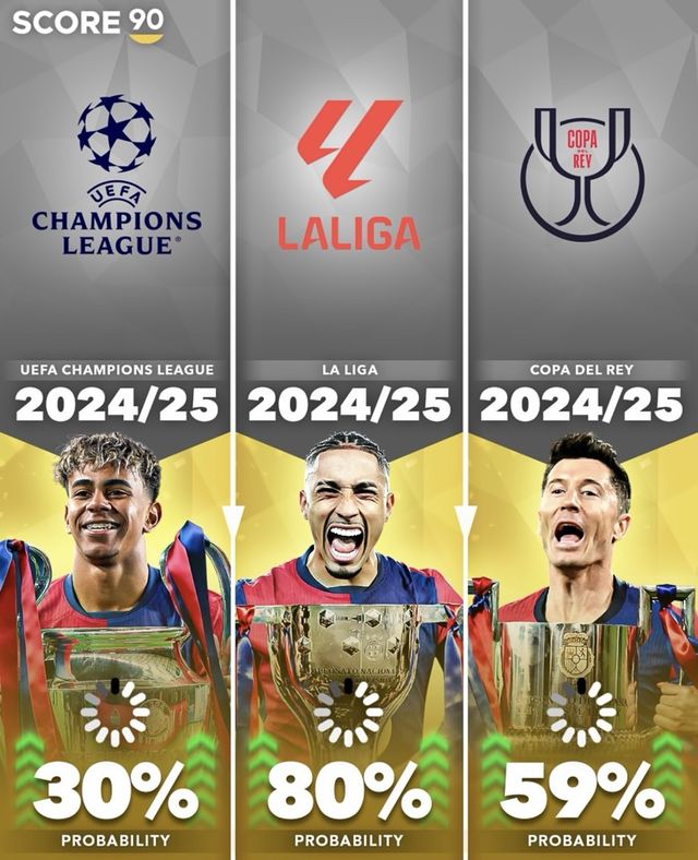 FC바르셀로나도 트레블 달성 후보 중 하나다. 스페인 라리가 1위인 바르셀로나의 리그 우승 확률은 무려 80%. 레알 마드리드와 코파 델 레이(스페인 국왕컵) 결승전 승리 가능성은 59%다. 바르셀로나의 UCL 정상 등극 확률은 30%로 PSG보다는 조금 높다.