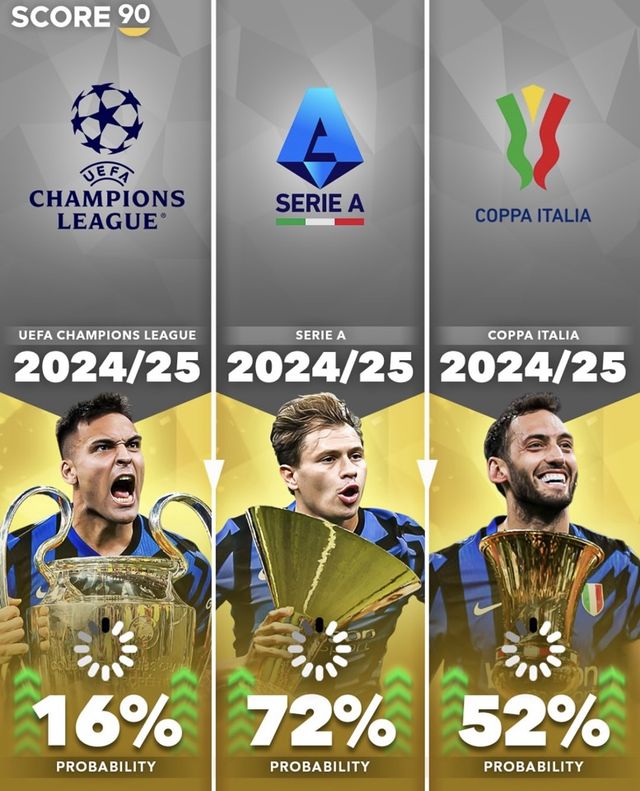 UCL 4강에 오른 인터 밀란도 트레블 가능성이 남아 있다. 다만 PSG보다는 확률이 떨어진다. 이탈리아 세리에 A 선두인 인터 밀란의 리그 제패 확률은 72%지만, 코파 이탈리아(이탈리아컵)와 UCL 우승 확률은 각각 52%, 16%다. 도박사들의 예측을 종합하면, 인터 밀란의 트레블 도전이 험난하리란 시각이 지배적이라는 것을 알 수 있는 대목이다.