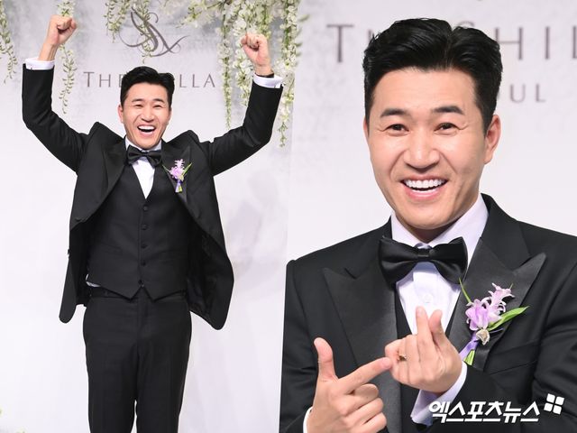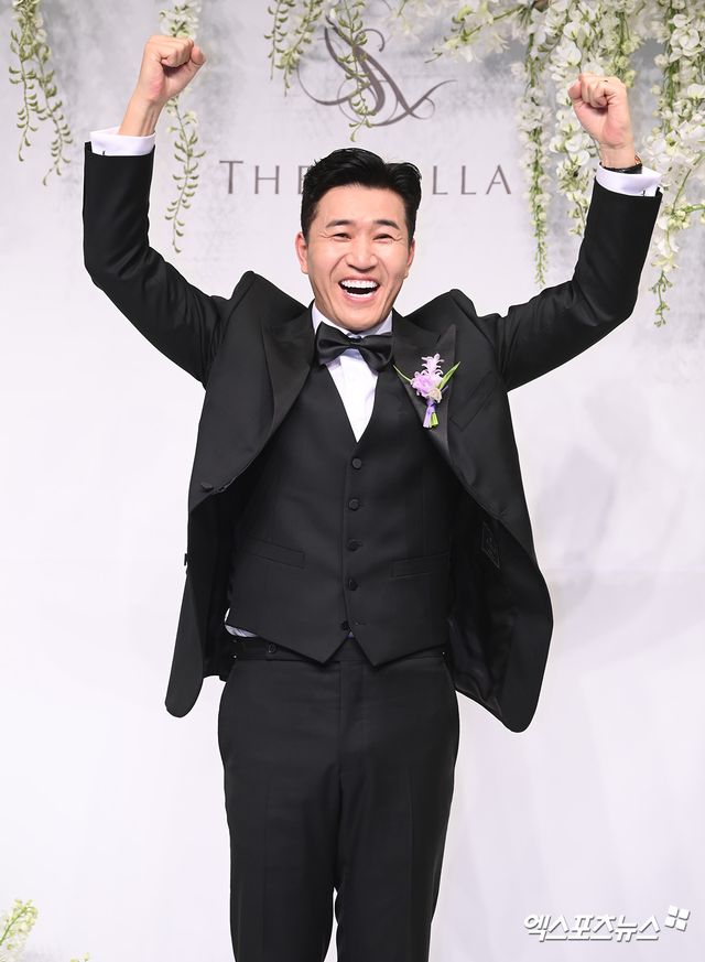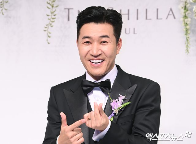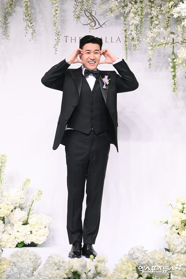 이날 결혼식 기자회견에 참석한 가수 겸 방송인 김종민이 포토타임을 갖고 있다.