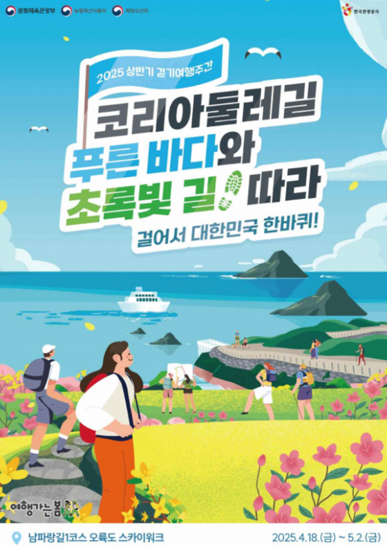 문화체육관광부는한국관광공사와 함께'코리아둘레길'을 비롯한 걷기여행길을 지역의 대표 관광콘텐츠로 육성하기 위해 18일부터 내달 2일까지 '2025년 상반기 걷기여행주간'을 운영한다고 밝혔다.
