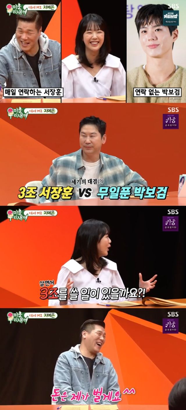 이날 신동엽은 “지예은이 금방 사랑에 빠지는 금사빠다. 매일 만나자고 연락하고 들이대면 결국 그 사람한테 마음을 뺏겨 만나는 스타일이다”라며 “예시가 있는데 박보검인데 절대 먼저 연락을 안 하는 것이랑 서장훈인데 매일 연락을 하는 것. 둘 중 누구를 만날 것이냐”고 질문했다.