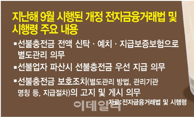 업계 한 관계자는 “규제가 촘촘하지 못한 상황에서 선불충전금 보호는 당분간 발행업자의 선행에만 의존할 수밖에 없다”며 “너무 많은 금액을 선불충전금으로 담아두지 말고 즉시 필요한 만큼만 결제하는 게 좋다”고 했다.
