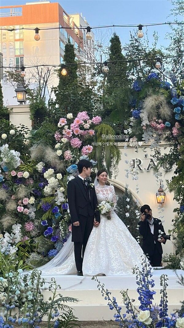 사진 속에서 에일리와 최시훈은 화려한 꽃장식 사이에서 나란히 손을 잡고 서 있다.