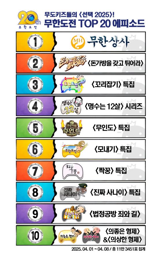 21일 MBC에 따르면 포털 사이트 네이버에서 진행된 '무한도전' TOP 20 에피소드 투표 결과, 총 11만3451표 중 6457표를 기록한 '무한상사' 시리즈가 1위를 차지했다. 이어 '돈가방을 갖고 튀어라', '꼬리잡기', '명수는 12살', '무인도' 특집 등이 차례로 2위부터 5위까지 차지했다.