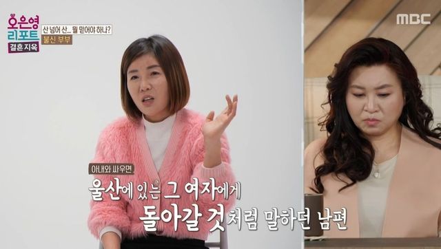그런 가운데 아내는 남편이 울산에 사는 여자와 동거했던 사실을 언급했다. 아내는 “울산 간다고 하면 그 여자가 전혀 생각 안 나겠냐. 너 맨날 나랑 싸울 때마다 그 여자한테 돌아갈 것처럼 말하잖아”라고 밝혔다. 남편은 “작년 7월에 정말 헤어지자고 해서 한 달 정도 헤어졌다. 전부터 알던 동생과 연락하면서 만나게 됐다. 20일 정도 같이 지냈다”고 전했다. 아내는 “헤어진 다음 주말에 그 여자와 라이브 방송에 나오더라”며 당시를 떠올렸다.