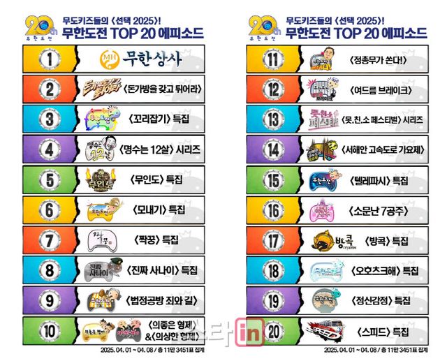 MBC에서는 ‘무한도전’ 20주년을 기념해 오는 6월까지 하이라이트 장면과 함께하는 주제별 투표를 이어간다.