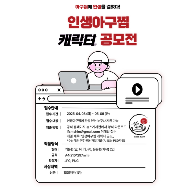 인생아구찜 관계자는 “캐릭터는 브랜드의 아이덴티티를 직관적으로 전달하고 고객과의 정서적 유대감을 형성하는 중요한 소통 도구”라며 “공모전을 통해 인생아구찜의 맛과 열정을 담은 개성 있는 캐릭터를 발굴해 온·오프라인 브랜딩을 강화하고, 마케팅과 굿즈 등을 활용해 보다 친숙한 이미지로 고객과 소통할 예정이다”고 말했다.