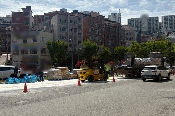 21일 낮 12시50분께 부산 중구의 한 교차로를 달리던 25t 화물차에 적재된 밀가루 포대 일부가 도로에 떨어졌다.