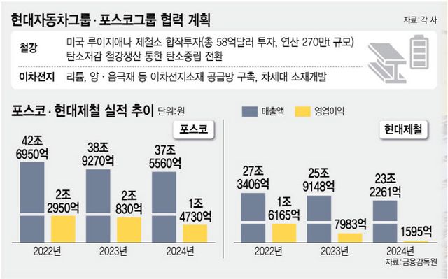 양사는 이차전지 소재 분야에서도 협력을 강화한다. 현재 글로벌 전기차 시장은 캐즘(chasm·일시적 수요 정체 현상)을 맞아 다소 주춤한 상태지만, 현대차그룹은 오는 2030년까지 연간 총 326만대의 전기차를 판매해 글로벌 전동화 시장을 선도한다는 계획이다. 이 과정에서 이차전지 핵심 소재를 안정적으로 공급받아 변수에 대응하고 원가 경쟁력도 확보하려는 것으로 분석된다. 포스코그룹은 해외 염호(鹽湖) 및 광산에 대한 소유권과 지분 투자 등을 통해 리튬 원재료를 안정적으로 확보하고 있으며, 국내외 사업장에서 전기차 배터리용 수산화리튬 및 양·음극재를 생산하고 있다. 또 장기적으로 차세대 소재를 개발하는 등 시너지를 발휘할 수 있는 분야를 발굴하는 형태로 협력을 이어나갈 계획이다.