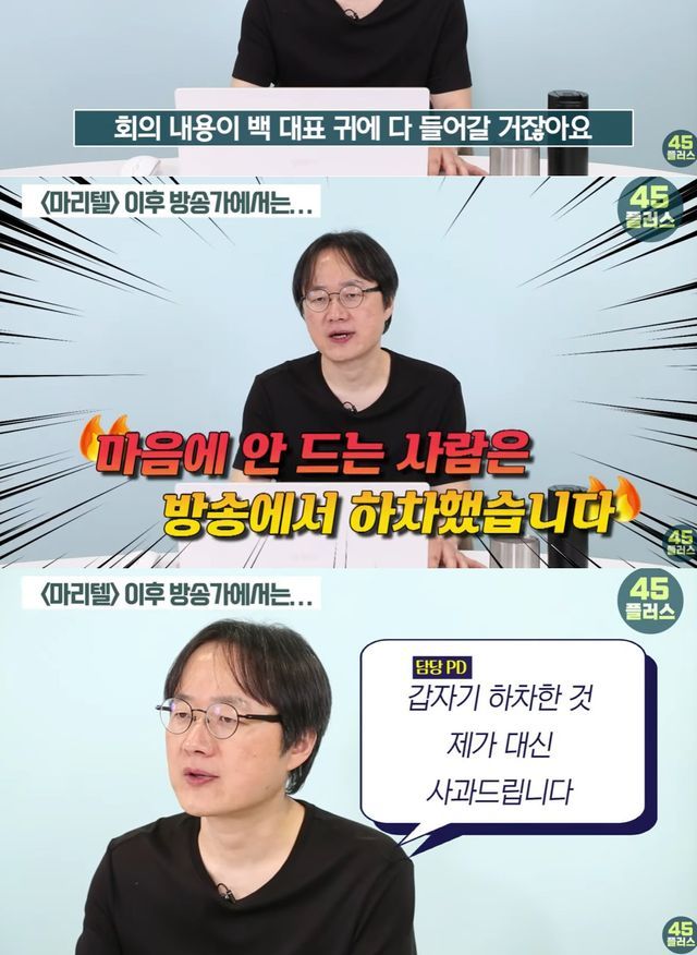 백종원은 '마리텔' 후 방송사에 점점 무리한 요구를 시작했다고 주장한 김재환 감독은 "프로그램에 내가 지명하는 작가팀, 촬영팀을 넣으라고 한다더라. PD는 미친다. 프로그램 분위기는 PD와 촬영팀 호흡이 중요한데, 백종원이 데려 온 촬영 팀이 백 대표 심기만 살피면 현장 권력은 백종원에게 쏠린다"고 이야기했다.