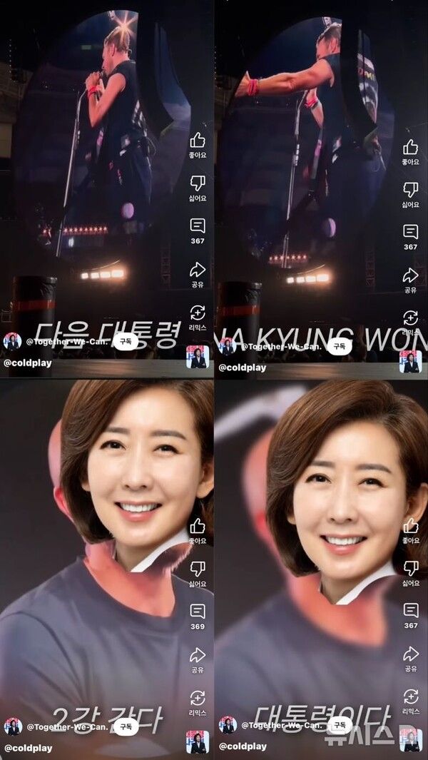 세계적인 밴드 콜드플레이가 8년 만의 내한 공연에 나선 가운데, 나경원 국민의힘 대선 경선 후보가 공연 장면을 임의로 편집해 자신의 홍보 영상을 만들었다가 비판을 받고 있다.