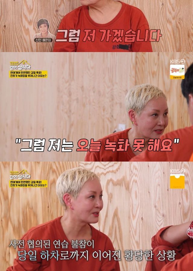 이를 들은 홍진희는 "일일극에서 섭외가 왔다. 연습 시간이 스케줄이 안 되어서 못 간다고 했다. 매번 연습에 빠지니 선배들은 꼴 보기 싫을 수 있지 않냐. 어느날 녹화하러 갔는데 느닷없이 내가 고향으로 빠지더라. 제작진에게 물어봤더니 막 핑계를 대길래 '녹화 오늘 못한다'고 했다"며 황당했던 한 촬영 현장을 폭로했다.