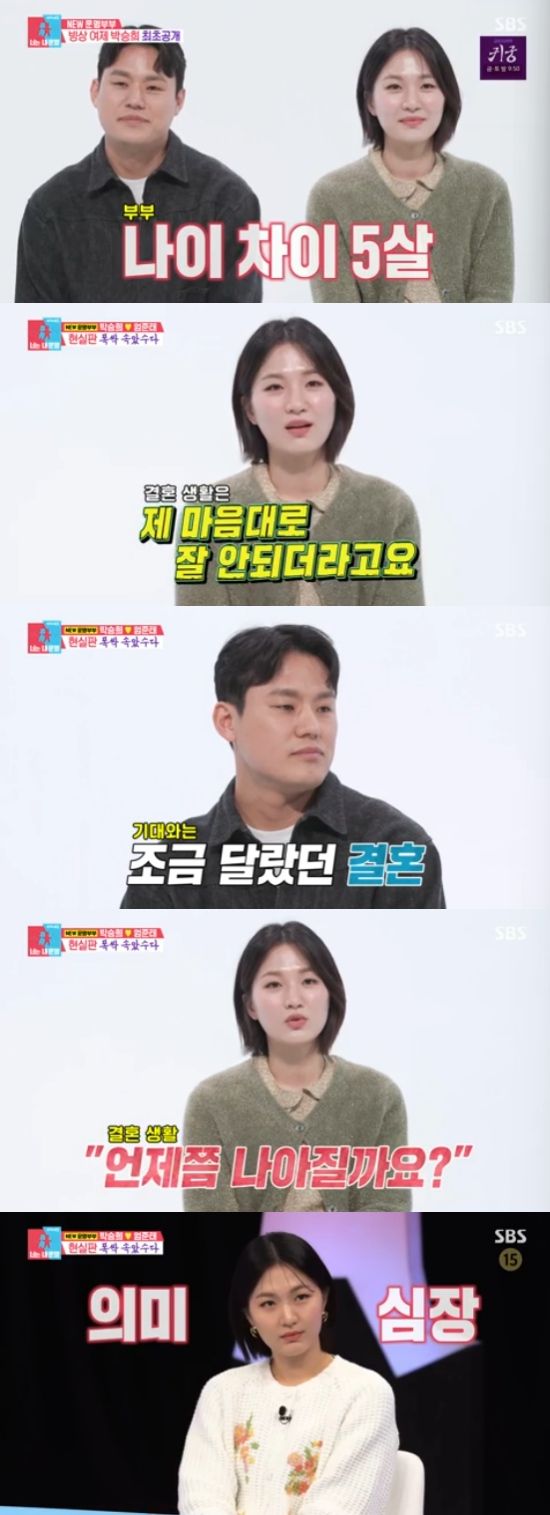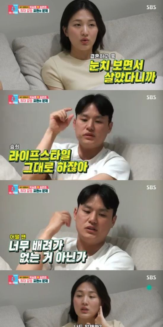 박승희는 "오빠는 말할 때 한숨부터 쉰다. 너무 상처고, 눈치가 보인다. 결혼 후 계속 눈치를 보고 살았다"고 말했고, 엄준태는 "내가 느끼기에는 (너가) 배려가 없다. 같이 사는 집인데 너의 라이프스타일 그대로 살려고 하지 않냐"고 받아쳤다.