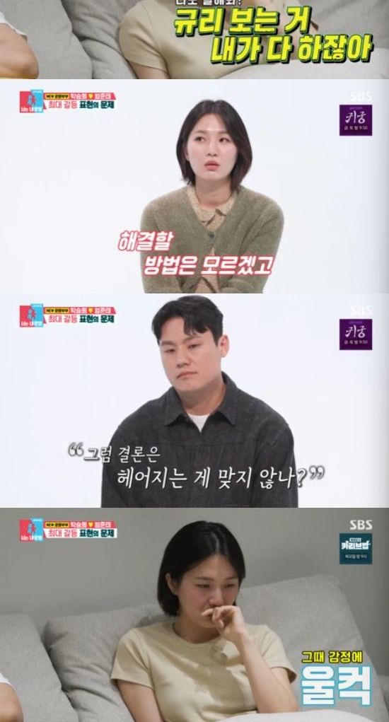 이를 들은 박승희는 "규리 보는 건 내가 다 하지 않냐. 오빠가 규리 목욕시킨 적이 언제야? 나도 오빠가 그렇게 해주는거 고마운데, 나도 오빠랑 같이 일하고 같이 퇴근한다. 오빠가 그렇게 한숨 쉬면서 말하는게 너무 힘들다"고 토로하면서 눈물을 보였다.