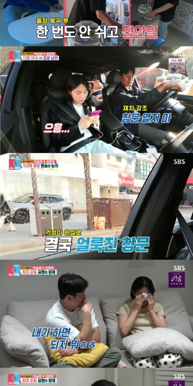 박승희 남편 엄준태는 자수성가한 유명 가방 브랜드 CEO로 박승희와는 정반대의 라이프 스타일로 호기심을 자아냈다. 청소부터 설거지까지 집안일을 도맡아 했고, 현재 26개월인 딸의 뒷바라지도 남편 몫이었다. 두 사람의 갈등은 뜻밖의 상황에서 터졌다. 남편은 “세차를 했으니 창문 내리면 얼룩이 남을 수 있다. 내리지 말라”고 여러 번 얘기했으나 박승희는 그것을 깜빡하고 창문을 내려버렸다. 결국 폭발한 남편은 짜증을 내며 한숨을 내쉬기 시작했고 박승희는 “까먹은 건 진짜 미안한데 그렇게 소리 지르면서까지 이야기하냐”고 서운해했다.