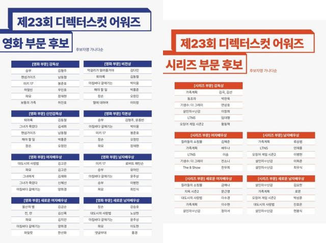 디렉터스컷 어워즈 측은 22일 제23회 시상식 영화 및 시리즈 부문 후보를 공개했다. 올해 후보자는 2024년 1월 1일부터 2025년 3월 31일 사이에 발표된 DGK(한국영화감독조합) 정·준회원 감독의 영화, 시리즈 중 선정했다.