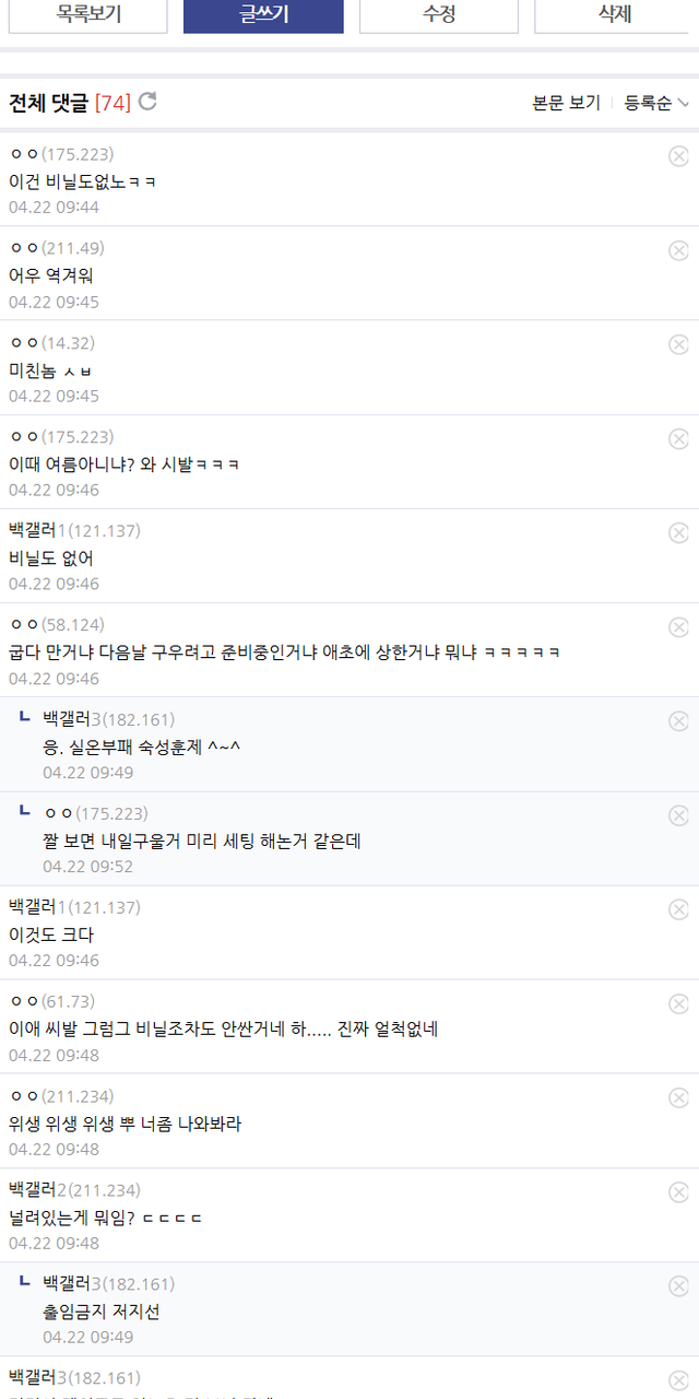 이번거는 아예 비닐조차도 없이 그냥 밤에 저렇게 빨래마냥 널려있었다고 함 ㄷㄷㄷㄷ