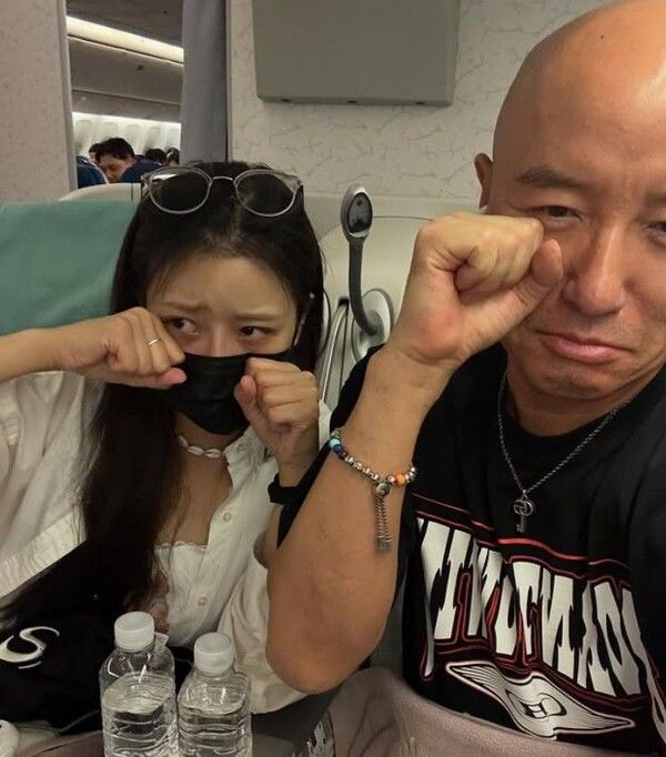 함께 공개한 사진 속 홍석천은 비행기 옆자리 미모의 여성과 뿌잉뿌잉 동작을 취하며 울상이다.