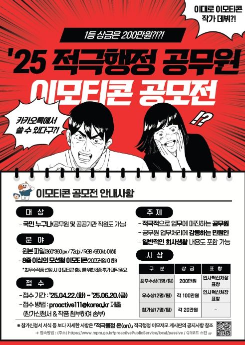 인사혁신처는 2025년 적극행정 공무원 그림말 공모전’을 개최하고, 오는 6월 20일까지 출품작품을 접수한다고 22일 밝혔다.