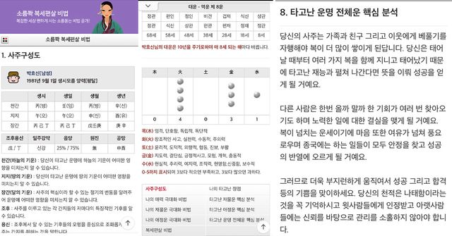 온라인 사주 전문 사이트 '위키사주'는 오랜 전통을 바탕으로 한 사주팔자와 현대적인 분석 기술을 결합하여 각자의 운명을 상세히 분석한다. 이름과 생년월일, 태어난 시간과 성별을 입력하면 간단하게 이용할 수 있다. 특히, 앞으로 3년 동안의 애정을 꿰뚫어볼 수 있는 애정운, 냉정하고 속시원한 궁합, 사랑에 관한 모든 것을 담은 타로까지 다양한 운세를 재미있게 점칠 수 있다.