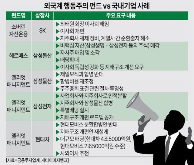 22일 금융투자업계에 따르면 국내에서 외국계 행동주의 펀드가 경영권을 흔든 대표적인 사례는 소버린자산운용·SK그룹, 헤르메스매니지먼트·삼성물산, 엘리엇매니지먼트·삼성물산, 엘리엇매니지먼트·현대차 사태 등을 꼽을 수 있다.