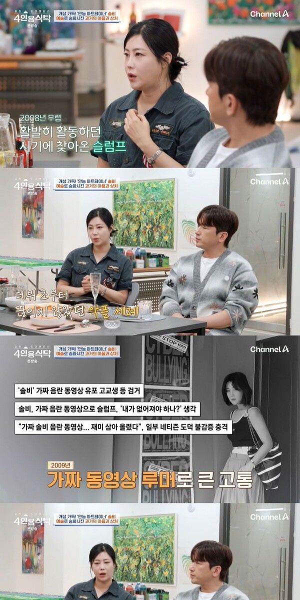 지난 21일 방송된 채널A ‘절친 토큐멘터리-4인용 식탁’에 출연한 솔비는 2년 만의 개인전을 앞두고 절친 이민우, 브라이언, 권혁수와 함께 ‘전시회 프리 오픈식’을 가졌다. 이 자리에서 솔비는 과거 슬럼프를 겪었던 시절을 떠올리며 "슬럼프가 좀 왔다. 가짜 동영상 루머도 있었고 개인적인 일도 많이 겪었다"고 조심스럽게 입을 열었다.