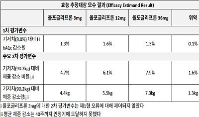 치료 요법 추정치 분석에서는 각 용량별로 3mg 투여 시 1.2%, 12mg 투여 시 1.5%, 36mg 투여 시 1.5%의 당화혈색소 감소 효과를 보였으며, 위약군은 0.4% 감소에 그쳤다.