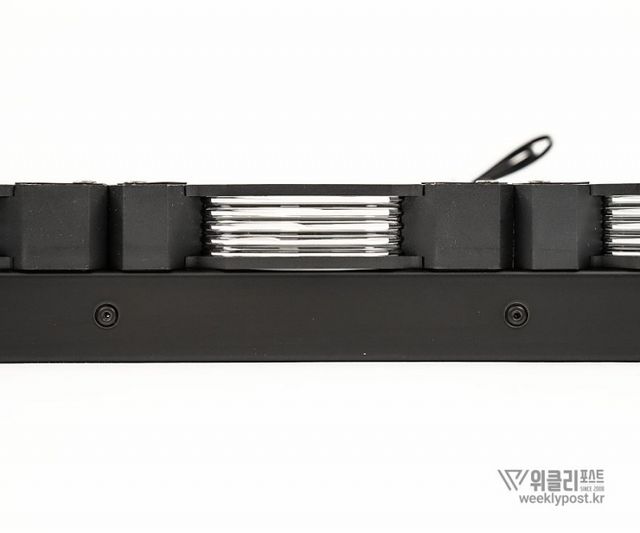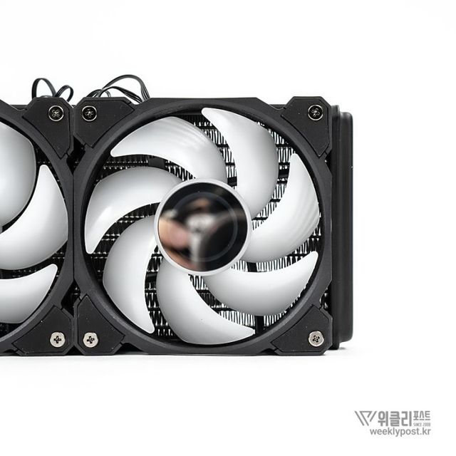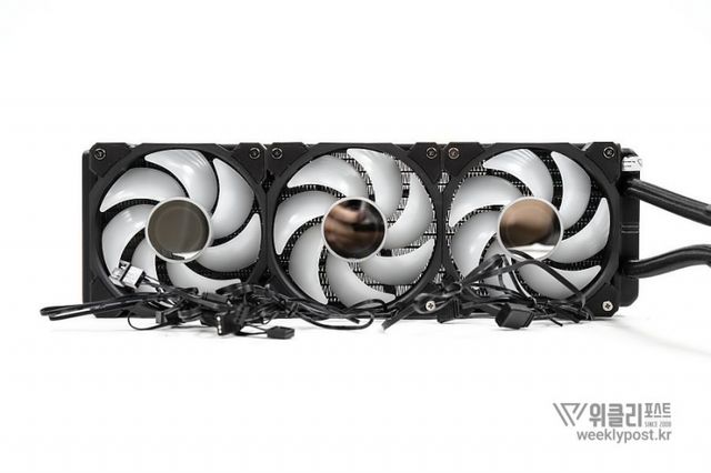 정렬된 방열 핀은 열을 빠르게 흡수하고, 공기의 흐름을 따라 자연스럽게 분산시킨다. 라디에이터는 단순한 냉각 장치를 넘어 열과 공기, 구조가 조화롭게 정렬된 하나의 조형물처럼 느껴진다. 이를 관통하는 세 개의 120mm 팬도 쿨링의 핵심이다. 최대 2000RPM, 풍량 59.1CFM, 정압 1.73mmH₂O의 수치는 강력한 성능을 의미하지만, 진짜 놀라운 건 소음이다. Hydro 베어링 구조는 회전하는 날개의 진동을 흡수하고 마찰을 줄여, 최대 30dBA 이하의 정숙한 작동을 구현한다.