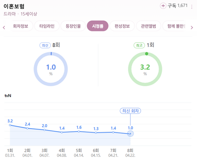 한편, ‘이혼보험’은 tvN 월화드라마 ‘반의반’이 기록한 1.1% 이후 tvN 월화 역대 최저 시청률을 기록했다. 당시 ‘반의반’은 1.1% 시청률에 머무르며 조기 종영 논란에 휘말린 바 있다.