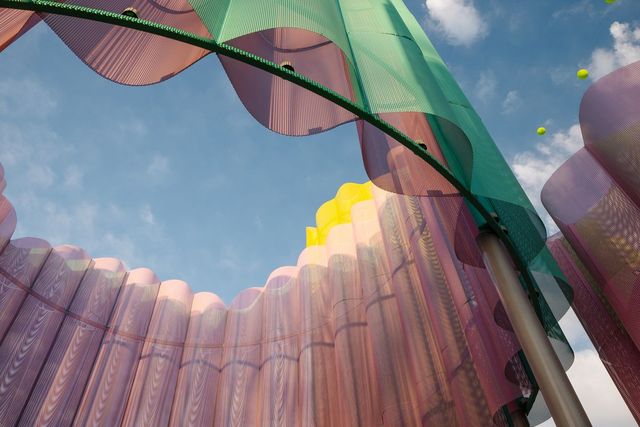첫 주자는 캐나다 디자이너 스테파니 린(Stephanie Lin). 그는 부채꼴 형태의 그물망을 입은 7개의 실린더를 광장에 우뚝 세웠어요. 바람이 불 때마다 일렁이는 그물망이 오묘한 패턴을 이뤄내며 신기루 같은 모습을 자아냈습니다. 다채로운 색감은 사막의 모더니즘에서 영감 받은 것이죠.