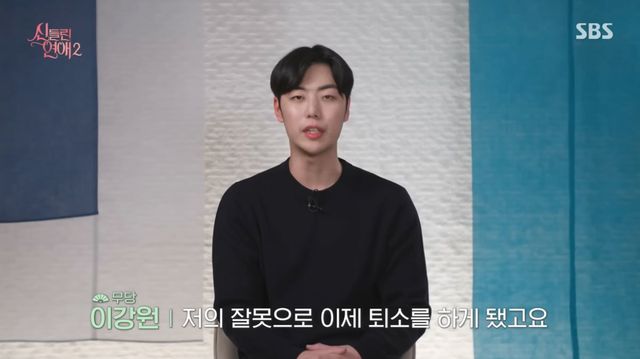 22일 방송된 SBS ‘신들린 연애2’에서 제작진은 출연진을 불러 모은 뒤 “공지드릴 일이 있다. 강원 씨가 규칙을 위반해서 퇴소 조치를 했다”면서 “함께 할 수 없는 이유가 있었다. 그걸 확인했고 그걸로 인해 퇴소했다”라고 설명했다.