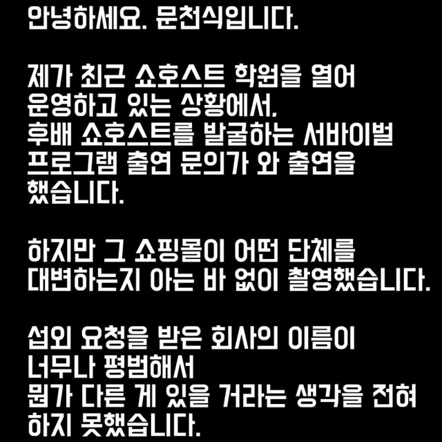 그는 "제가 최근 쇼호스트 학원을 열어 운영하고 있는 상황에서 후배 쇼호스트를 발굴하는 서바이벌 프로그램 출연 문의가 와 출연을 했습니다. 하지만 그 쇼핑몰이 어떤 단체를 대변하는지 아는 바 없이 촬영했습니다. 섭외 요청을 받은 회사의 이름이 너무나 평범해서 뭔가 다른 게 있을 거라는 생각을 전혀 하지 못했습니다"라고 설명했다.
