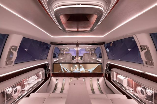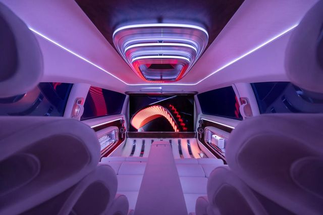 진정한 하이라이트는 뒷좌석에 있다. 바닥에서 자동으로 올라오는 65인치 4K 시네마 스크린과 이를 보조하는 42개 스피커, 7개의 프로젝터가 탑재돼 탑승자는 360도 몰입형 엔터테인먼트를 경험할 수 있다. 심지어 차량의 창문도 추가 투사면으로 활용 가능하다.