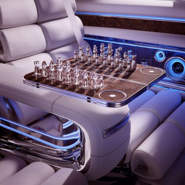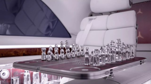 시트는 수정빛 화이트 컬러의 나파 가죽과 실크 소재로 마감된 라운지 체어가 두 개 배치됐으며, 전자동 리클라이닝 기능을 통해 좌석을 완전히 눕혀 침대처럼 사용할 수도 있다. 또한, 접이식 테이블은 체스판으로도 변환돼 탑승자가 다양한 활동을 즐길 수 있다.