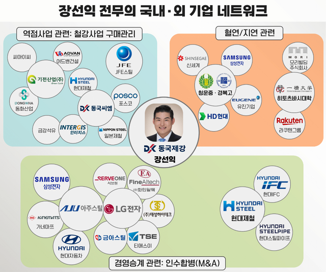 장 전무가 원재료 구매를 총괄하고 있는 또 다른 기업인 동국씨엠은 지난해 말 기준 포스코, 현대제철 등의 국내 철강 기업과 JFE스틸, 일본제철(NSC) 등 일본 철강 기업들로부터 원재료 약 1조원을 매입했다. 일본 1위 철강사인 일본제철은 최근 미국 철강업체 US스틸 인수 의사를 밝혔을 정도로 막강한 자본력을 갖춘 기업이다.