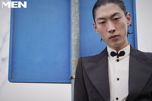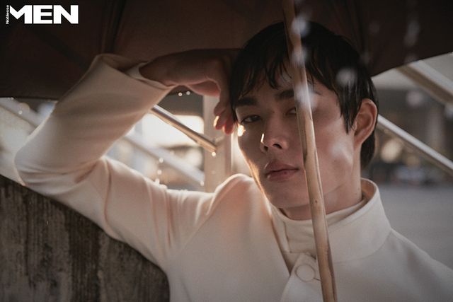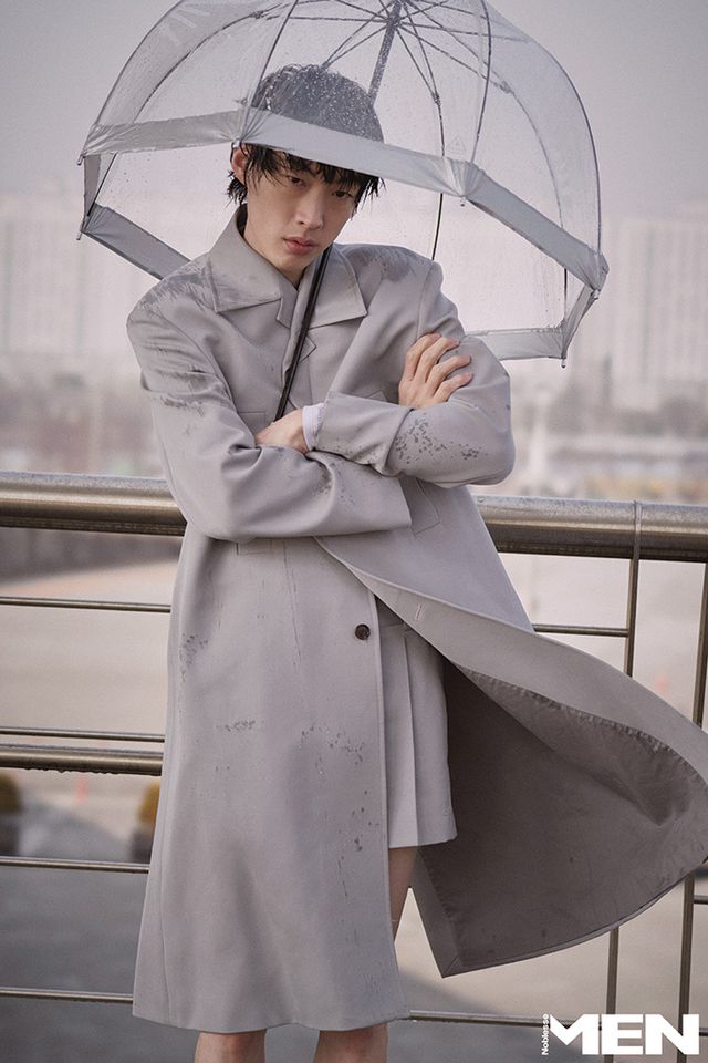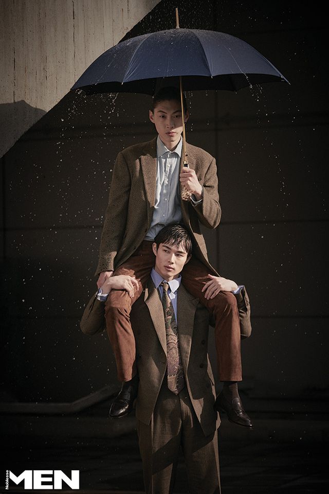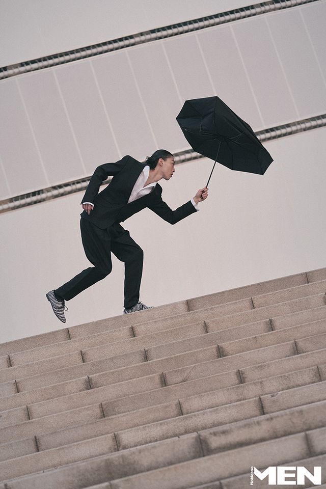 태민 _ 울 소재 싱글브레스트 재킷과 셔츠, 스웨이드 팬츠 모두 Ralph Lauren Purple Label, 브라운 페니 로퍼와 양말 모두 스타일리스트 소장품, 금장 사자 머리 손잡이의 자동 우산 Pasotti by Noblesse Mall.