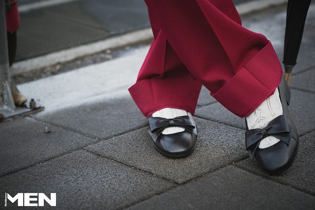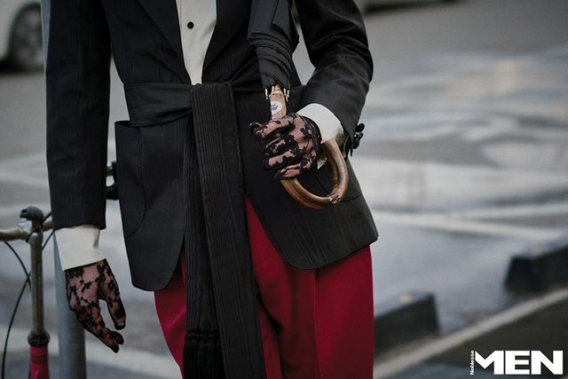벨트 장식 블랙 재킷과 토글 장식 셔츠, 버건디 팬츠, 레이스 양말 모두 Valentino, 레이스 장갑과 보와우 펌프스 모두 Valentino Garavani, 대나무 손잡이 블랙 수동 우산 Pasotti by Noblesse Mall.