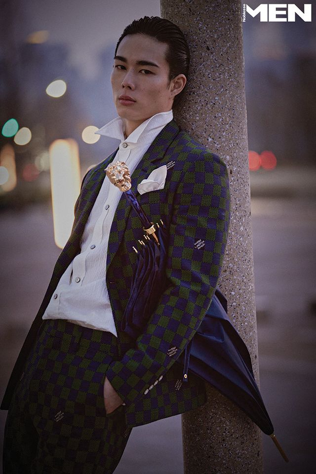 다미에 패턴 슈트와 화이트 셔츠 모두 Louis Vuitton, 포켓스퀘어 스타일리스트 소장품, 금장 사자 머리 손잡이의 자동 우산 Pasotti by Noblesse Mall.