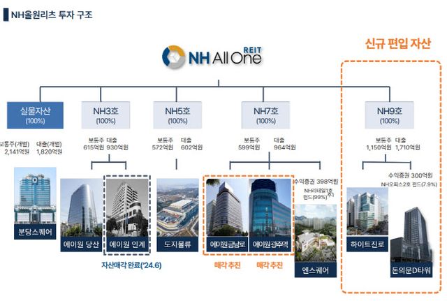 NH올원리츠가 보유한 자산은 △오피스 분당스퀘어(비전월드 주차장 포함) △오피스 에이원(A1)타워 당산(NH3호리츠(당산)) △도지물류센터(NH5호리츠) △리테일 엔스퀘어(NH7호리츠(NH리테일제1호펀드)) △오피스 에이원(A1)타워 금남로(NH7호리츠) △오피스 에이원(A1)타워 광주역(NH7호리츠) 등이다.
