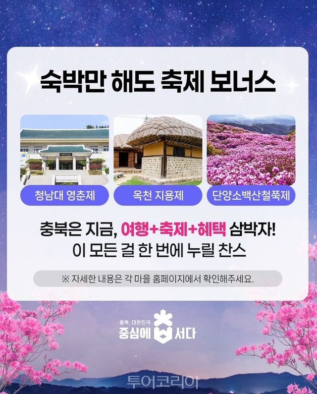 봄철 관광 성수기를 맞아 4~5월 청남대 영춘제, 옥천 지용제, 단양 소백산 철쭉제 등 다양한 축제와 행사를 찾는 관광객에게 숙박료 환급으로 기쁨의 보너스를 선사할 예정이다.