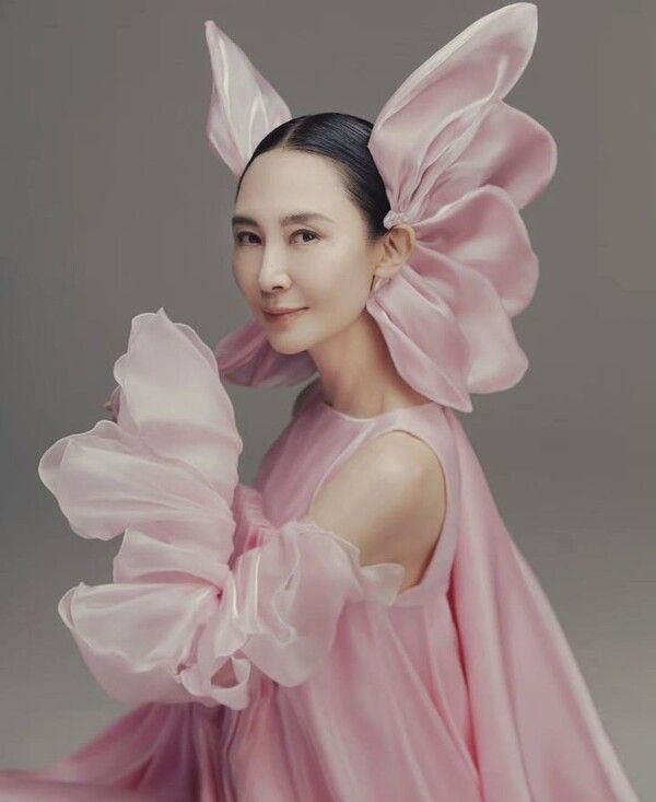 분홍색 꽃잎 모형을 귀 뒤에 꽂은 채 세련된 분위기를 더했다.
