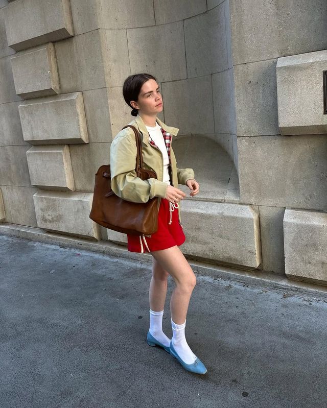 레드가 아직 부담스럽다면, 얼굴과 가장 먼 하의부터 시작해보세요. 리즈 블루스타인은 스포티한 레드쇼츠로 경쾌한 빈티지 캐주얼 룩을 완성했습니다. 체크 안감이 살짝 보이는 베이지 재킷과 아이보리 티셔츠 사이에서 중심을 단단하게 잡아준 건 단연 레드였죠. 여기에 하늘색 플랫 슈즈와 흰 양말로 산뜻함마저 더했네요.