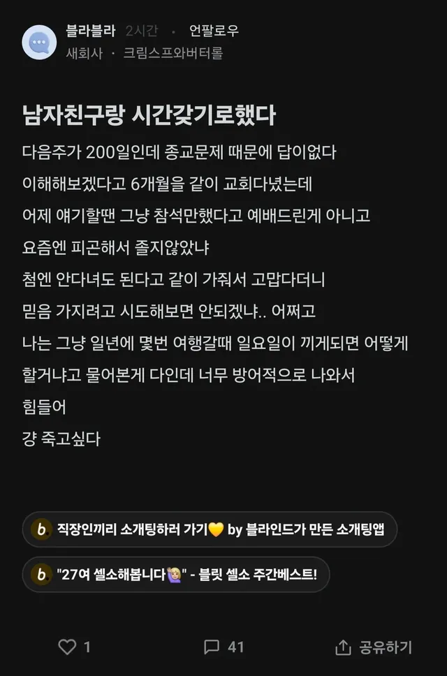 종교문제 때문에 남친이랑 시간 갖기로 했다