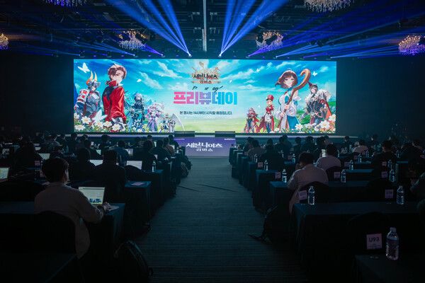 관련해 회사 측은 24일 서울 구로구 지타워 사옥서 ‘세븐나이츠 리버스 프리뷰데이’를 개최하고 게임에 대한 정보 소개 및 질의에 응답하는 시간을 가졌다. 간담회 시작전 컨벤션 홀 밖에 마련된 사전 체험 부스에는 게임을 플레이하기 위해 유저들의 줄이 길게 늘어서 눈길을 끌었다.