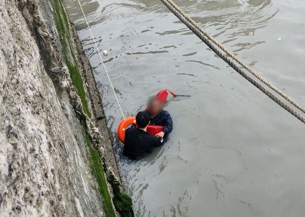 현장에 출동한 해경은 선박 충돌파손 방지 장치(방현재)를 붙잡고 버티고 있던 A씨를 발견했다. 곧장 바다에 입수한 경찰관은 신고 접수 7분 만에 A씨를 무사히 구조했다.
