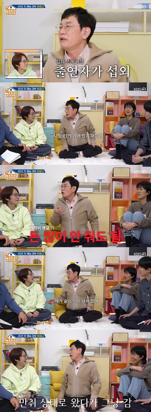 24일 방송된 KBS2 ‘옥탑방의 문제아들’에서는 베스트셀러 작가로 돌아온 이경규가 출격, 예능계에서 활약 중인 ‘옥문아’ 6MC를 향해 뼈있는 독설을 날리며 예능 대부다운 독보적인 존재감을 뽐냈다.