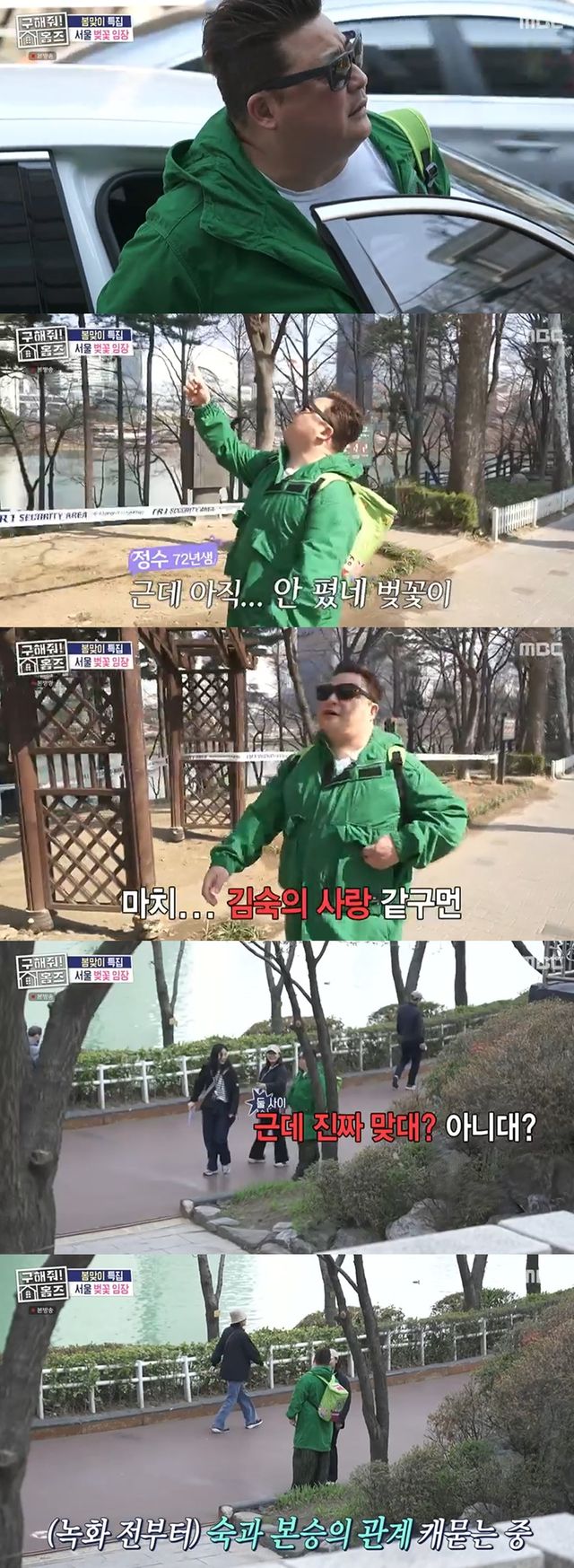 이후 초록색 바람막이를 입고 등장한 윤정수는 "벚꽃이 아직 안 폈다. 마치 김숙의 사랑 같다"고 감상평을 전했다.
