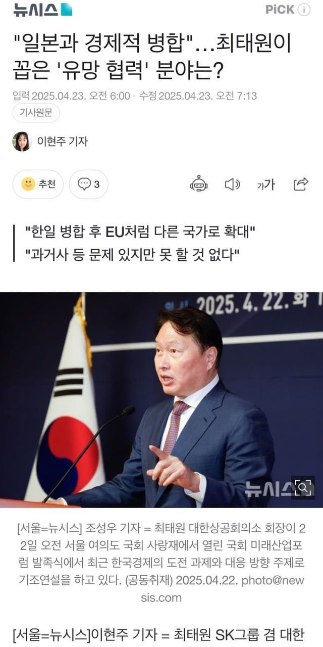 최태원이 일본과 경제적 합방을 해야 한다고 하네 ㅋㅋㅋㅋ