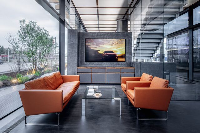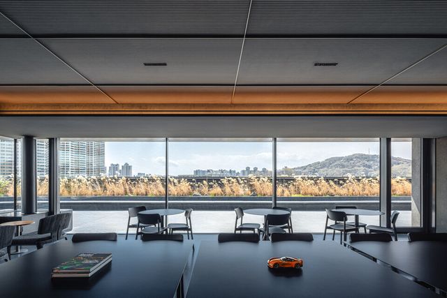 먼저 1층에는 60m 길이로 길게 드리워진 나무 캐노피 아래 리셉션과 시승 및 인도 고객을 위한 라운지가 위치하며, 특히 고객들이 거대한 캐노피가 드리운 공간에 첫 발을 들임으로써 환대를 받는다는 느낌을 가지도록 했다.